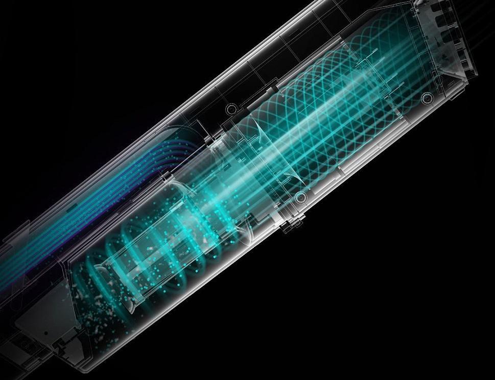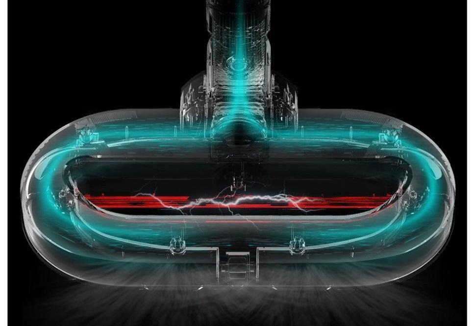 Для повышения эффективности уборочных работ была разработана инновационная щетка, имеющая круговой канал для прогона мусора. Такая конструкция позволяет собирать сор в два раза эффективнее, чем используя обычную одноканальную насадку. В щетку интегрирован генератор статического электричества, который притягивает пропущенный мусор. Мощный двигатель генерирует силу засасывания на уровне 14000 Ра. Пылесос может очистить даже ковры с длинным ворсом.