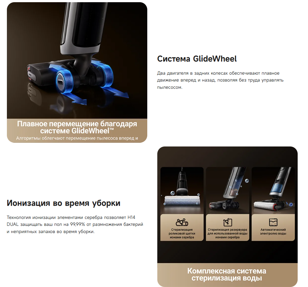 Два двигателя в задних колесах обеспечивают плавное движение вперед и назад, позволяя без труда управлять пылесосом - Ионизация во время уборки
