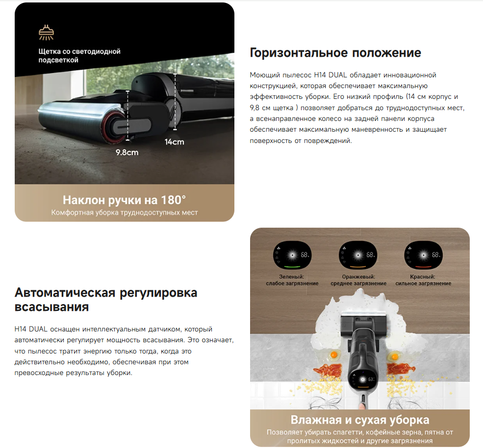 Моющий пылесос H14 Dual обладает инновационной конструкцией, которая обеспечивает максимальную эффективность уборки. Его низкий профиль (14 см корпус и 9.8 см щётка ) позволяет добраться до труднодоступных мест, а всенаправленное колесо на задней панели корпуса обеспечивает максимальную маневренность и защищает поверхность от повреждений - Автоматическая регулировка всасывания