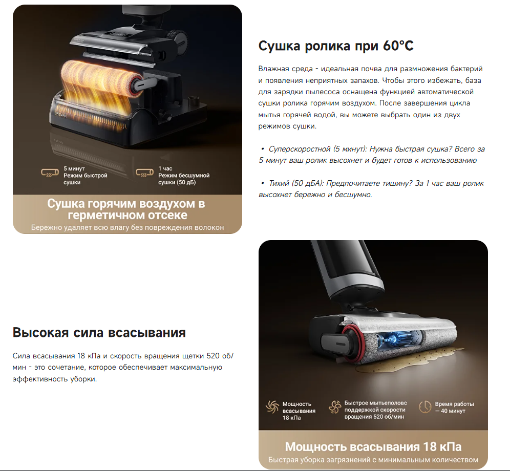 Влажная среда - идеальная почва для размножения бактерий и появления неприятных запахов. Чтобы этого избежать, база для зарядки пылесоса оснащена функцией автоматической сушки ролика горячим воздухом. После завершения цикла мытья горячей водой, вы можете выбрать один из двух режимов сушки. Суперскоростной (5 минут): всего за 5 минут ваш ролик высохнет и будет готов к использованию. Тихий (50 дБА): за 1 час ваш ролик высохнет бережно и бесшумно