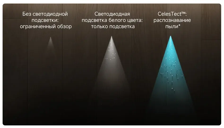 Технология подсветки CelesTectтм выявляет скрытый мусор в тускло о свещенных помещениях и темных углах, делая уборку простой и эффективной.